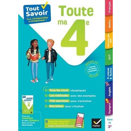 Un ouvrage avec toutes les matières de la 4e. Sur chaque notion du programme : un cours visuel, la méthode clé et des exercices. Idéal pour préparer les contrôles tout au long de l'année ou réviser pendant les vacances. Un onglet par matière - L'ouvrage est structuré à l'aide d'onglets permettant de retrouver facilement la matière sur laquelle on veut travailler : français, maths, histoire-géographie, EMC, physique-chimie, SVT, technologie, anglais, espagnol. - A chaque thème au programme d'une matière est associée une séquence de révision sur une double-page, qui comprend : - un rappel de cours clair et visuel - une méthode appliquée à des exemples - des exercices progressifs (corrigés dans le guide parents) Tout au long de ses révisions, votre enfant est accompagné et conseillé. En plus : les deux onglets Moi en 4e et Vers la 3e - Les activités proposées dans l'onglet Moi en 4e incitent votre enfant à réfléchir sur son profil d'apprentissage et les méthodes à mettre en oeuvre pour être plus efficace. - Le dernier onglet Vers la 3e lui permet de découvrir, dans chaque matière, le programme de l'année suivante et d'identifier les notions incontournables. Le guide parents détachable - Ce guide vous donne accès aux corrigés détaillés de tous les exercices - Vous sont proposés également des informations sur l'organisation des enseignements en 4e et des conseils pour bien accompagner votre enfant. Un site d'entraînement pour réviser autrement En accès gratuit, avec l'achat du livre, sur www. hatier-entrainement. com : - des exercices interactifs en français et en mathématiques - des dictées sonorisées - des quiz audio en anglais et en espagnol
