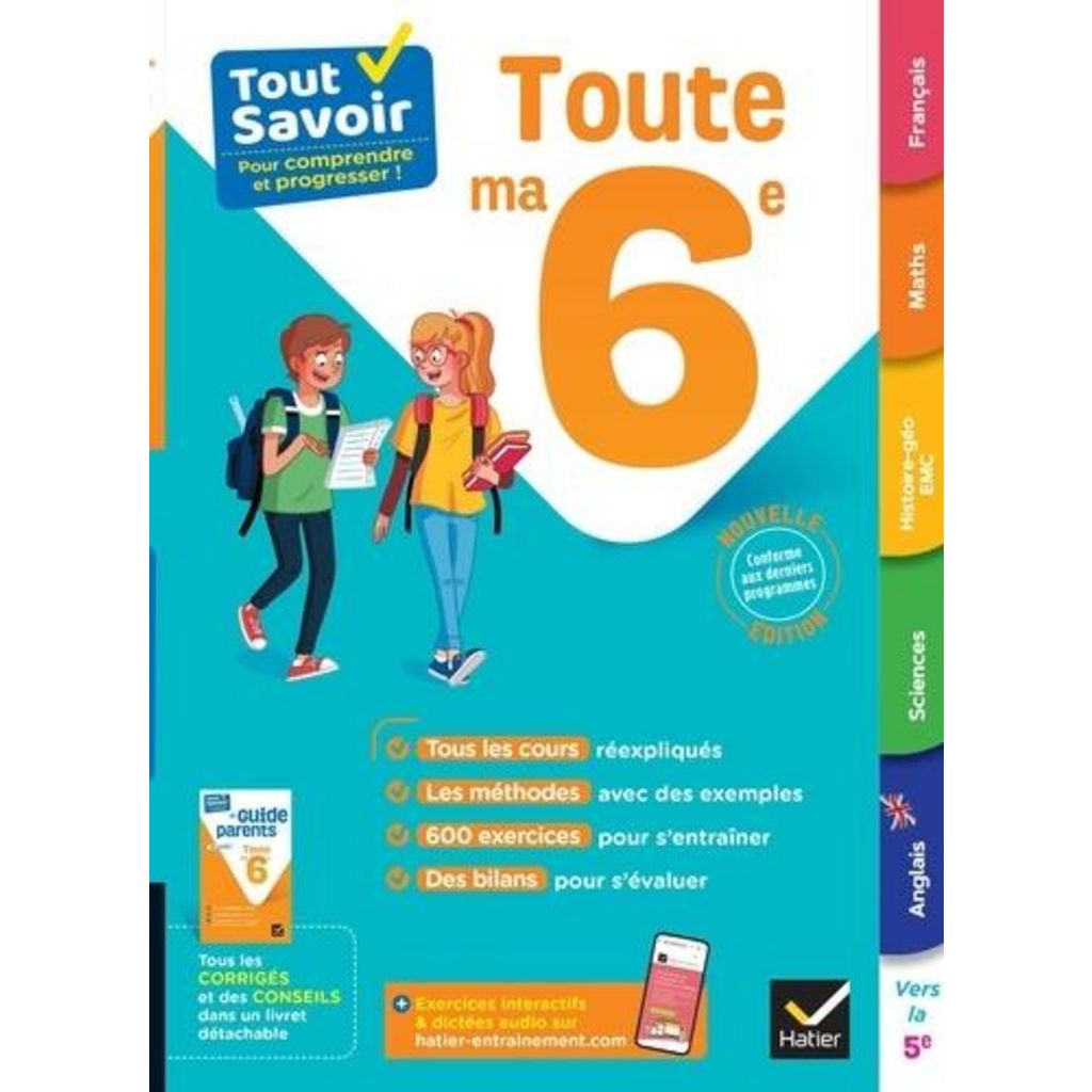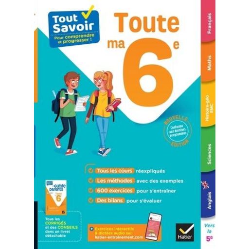 Un ouvrage, conforme aux derniers programmes, avec toutes les matières de la 6e. Sur chaque notion : un cours visuel, la méthode clé et des exercices. Idéal pour préparer les contrôles tout au long de l'année ou réviser pendant les vacances. Un onglet par matière - L'ouvrage est structuré à l'aide d'onglets permettant de retrouver facilement la matière sur laquelle on veut travailler : français, maths, histoire-géographie, EMC, sciences & technologie ou anglais. - A chaque thème au programme d'une matière est associée une séquence de révision sur une double-page, qui comprend : - un rappel de cours clair et visuel - une méthode appliquée à des exemples - des exercices progressifs (corrigés dans le guide parents) Tout au long de ses révisions, votre enfant est accompagné et conseillé. En plus : les deux onglets Moi en 6e et Vers la 5e - Les activités proposées dans l'onglet Moi en 6e incitent votre enfant à réfléchir sur son profil d'apprentissage et les méthodes à mettre en oeuvre pour être plus efficace. - Le dernier onglet Vers la 5e lui permet de découvrir, dans chaque matière, le programme de l'année suivante et d'identifier les notions incontournables. Le guide parents détachable - Ce guide vous donne accès aux corrigés détaillés de tous les exercices - Vous sont proposés également des informations sur l'organisation des enseignements en 6e et des conseils pour bien accompagner votre enfant. Un site d'entraînement pour réviser autrement En accès gratuit, avec l'achat du livre, sur www. hatier-entrainement. com : - des exercices interactifs en français et en mathématiques - des dictées sonorisées - des quiz audio en anglais