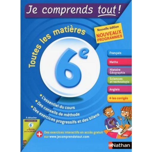 Toutes les matières dans un seul livre, pour réviser le programme de 6ème. Pour les enfants : Des cours clairs et complets conformes aux nouveaux programmes, Des conseils de méthodologie à chaque chapitre, des astuces et les pièges et erreurs à éviter, Différents niveaux de difficultés pour des exercices progressifs et un exo défi par matière pour aller plus loin, Des bilans pour s'évaluer dans chaque discipline. Pour les parents le guide détaillé, détachable, contenant : Une explication claire des nouveaux programmes, Des conseils pour aider l'enfant à progresser dans chaque matière, Des informations sur la scolarité, Les corrigés des exercices et bilans. Accès gratuit en ligne avec : Des exercices interactifs en français et en maths, Un espace dédié aux parents avec des conseils sur les matières et le programme, Des réponses à toutes les questions sur le collège.
