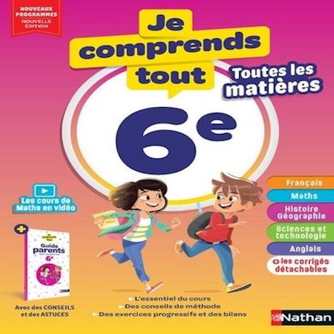 Toutes les matières dans un seul livre, pour réviser le programme de 6ème ! Accompagnez votre enfant dans sa réussite au collège avec ce livre de soutien scolaire complet ! Programme complet 6e : français, mathématiques, histoire-géographie, sciences et technologie, anglais sont traités dans ce livre de révision avec des leçons claires, des définitions précises, des méthodes détaillées et des exercices progressifs incluant dictées et mini-contrôles. Chaque cours est enrichi de vidéos explicatives pas à pas, visuelles et motivantes, accessibles instantanément via QR codes. Conçu par des enseignants spécialement pour le travail à la maison et l'aide aux devoirs. Guide parents détachable expliquant le programme officiel avec un les corrigés détaillés, des conseils de méthode pour l'aide aux devoirs. Manuel conforme aux nouveaux programmes 6e.