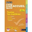 Toutes les matières pour préparer et réussir votre BAC PRO Métiers de l'Accueil ! Tout le programme des épreuves du BAC PRO Accueil traité dans des fiches claires et synthétiques : - Le cours complet : pour approfondir et comprendre les notions de chaque discipline. - Des exercices et leurs corrigés pour t'entraîner pour les contrôles et pour le BAC. - Des méthodes pour le BAC : la présentation des épreuves du BAC PRO et les conseils méthodologiques. Livre en ligne INCLUS : pour l'achat de cet ouvrage, consulte l'intégralité de ton livre sur de nombreux supports (PC/Mac, Tablettes et Smartphones...). En savoir plus sur www. nathan. fr/livre-en-ligne ET EN PLUS. Un dossier Je gère mon BAC : les méthodes de l'examen, les enjeux du BAC, et des conseils pour l'admission Parcoursup.
