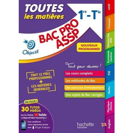 Conforme aux nouveaux programmes, cet ouvrage a été conçu pour vous accompagner pendant vos années de Première et Terminale du Bac Pro Accompagnement, soins et services à la personne (ASSP) : Les cours complets dans toutes les matières, pour réviser et mémoriser l'essentiel , Des schémas et des exemples, pour bien comprendre , Tout pour réussir l'épreuve de français : tous les objets d'étude et le programme limitatif Le jeu : futilité, nécessité , les connaissances indispensables, des fiches méthodes accompagnées d'exercices et un sujet-type entièrement corrigé , Des exercices progressifs et tous les corrigés, pour s'entraîner , Les méthodes du bac, illustrées par des sujets-types corrigés , Le descriptif détaillé des épreuves : définitions, durées, coefficients...
