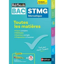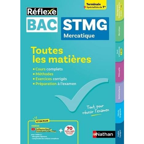 Toutes les matières pour préparer et réussir ses années de Première et de Terminale en STMG - Spécialité Mercatique. Un ouvrage complet avec cours, exercices corrigés et ressources numériques pour une préparation optimale à toutes les épreuves. Conformes aux programmes, toutes les matières du Bac STMG (Management, Sciences de gestion et numérique, Mercatique, Droit et Economie, Philosophie, Mathématiques, Histoire-Géographie, Anglais-Espagnol) traitées dans un ouvrage clair et synthétique : - Cours complets sous forme de fiches illustrées - Méthodes détaillées pour chaque épreuve - Exercices corrigés dans toutes les matières - 70 tutos et quiz en ligne - Accès gratuit à la version numérique En savoir plus sur www. nathan. fr/livre-en-ligne Contenu enrichi : > Tutos Pack Office (Word, Excel, PowerPoint) > Exercices en français et anglais > Conseils personnalisés des professeurs > QR codes pour accès rapide aux ressources > Guide des coefficients et durées d'épreuves ET EN PLUS : - Des vidéos du YouTubeur Guillaume Ravet spécialement conçues pour t'entraîner et te préparer aux épreuves de spécialité ! - Un dossier Je gère mon BAC : les méthodes de l'examen, les enjeux du BAC, et des conseils pour l'admission Parcoursup.