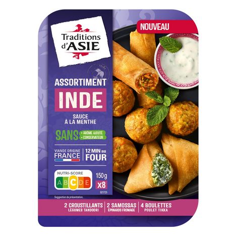 Ingrédients : Produits frits à l'huile de tournesol. Pourcentages exprimés sur chaque bouchées avant friture. Boulettes à base de poulet et protéines de SOJA, assaisonnement tikka 4x15g : Eau, viande de poulet origine France 20%, oignon, carotte, protéine de SOJA texturée 11,2%, CREME, amidon de maïs, chapelure (farine de BLE, sel), double concentré de tomate, OEUF entier en poudre de poules élevées en plein air, sauce SOJA (eau, graine de SOJA, farine de BLE, sel), ciboulette, purée d'ail, épices (cumin, paprika, curcuma, gingembre, piment fort, cannelle, poivre), sel. Croustillant aux légumes et épices tandoori 2x20g : Galette de riz 57% [eau, farine de riz, caramel (sucre, eau), sel], vermicelle de pois réhydraté, carottes 5,7%, oignons 5,7%, aubergines 5,7%, pomme de terre, farine de SOJA texturée, champignon noir réhydraté 2,8%, eau, EMMENTAL, épices tandoori 0,9% (paprika, cumin, curcuma, piment, cannelle, coriandre en poudre), double concentré de tomates, OEUF entier en poudre de poules élevées en plein air, purée d'ail, amidon de maïs, coriandre feuille, sauce soja (eau, graine de SOJA, farine de BLE, sel), sel. Samossa FROMAGE épinards 2x15g : Galette de BLE 52,7 % (eau, farine de BLE, blanc d'OEUF en poudre de poules élevées en plein air, sel, émulsifiant : lécithine de colza), oignon, eau, épinard 7,6%, FROMAGR de brebis 6,1%, RICOTTA de brebis 5,6%, courgettes, amidon de maïs, fibre de BLE, coriandre, blanc d'OEUF en poudre de poules élevées en plein air, huile de tournesol, purée d'ail, olive noire, sel, sucre, romarin, thym, basilic, marjolaine, poivre blanc. Sauce à la menthe 20g : Eau, FROMAGE blanc, huile de colza, amidon de maïs, menthe 3%, vinaigre d'alcool, sel, sucre, ail, jus concentré de citron jaune, jaune d'OEUF en poudre de poules élevées en plein, poivre. Traces possibles de : poissons, crustacés