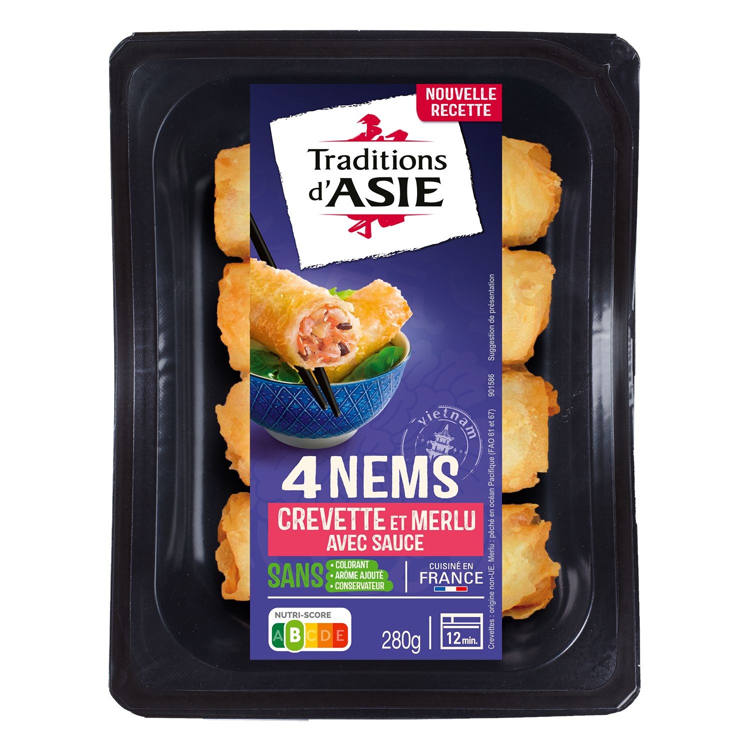 Ingrédients: Nems aux CREVETTES et au MERLU 4 x 60 g : galette de riz 39,8% (eau, farine de riz, sel), vermicelles réhydratés 14,7% (eau, amidon de pois), CREVETTES décortiquées 10,8% (CREVETTES, sel, SULFITES), MERLU 6,9%, carottes, oignons, protéines de SOJA texturées, jus de LANGOUSTINE, eau, amidon de maïs, ciboule, farine de tapioca, champignons noirs réhydratés 1,8%, fibre de bambou, ail en poudre, sel, poivre. Produits frits à l'huile de tournesol. Pourcentages exprimés sur les nems avant friture. Sauce nuoc-mâm 1 x 40 g : eau, sucre, vinaigre d'alcool, sel, nuoc-mâm 1,6% (POISSON, sel, eau), sauce SOJA (eau, graines de SOJA, sel, farine de BLE); Pourcentage exprimé sur la sauce. Galette : cuisinée en France. Crevettes : origine non-UE. Merlu : pêché en océan Pacifique (FAO 61 et 67) Traces possibles de : mollusques, lait, oeuf, céleri, moutarde, sésame.