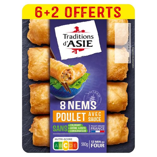 Ingrédients: Nems au poulet 8 x 60 g : galette de riz 37,5% (eau, farine de riz, sel), vermicelles réhydratés (eau, amidon de pois), viande de poulet origine France 11,5%, carottes, peau de poulet rôtie et gras 6,9% (peau de poulet origine France, miel), oignons préfrits (oignons, huile de tournesol), huile de tournesol, oignons, champignons noirs réhydratés, eau, farine de SOJA texturée, sauce POISSON (POISSON, sel, eau), protéines de SOJA, sel. (pourcentages exprimés sur les nems) Sauce nuoc-mâm 2 x 40 g : eau, sucre, vinaigre d'alcool, sel, nuoc-mâm 1,6% (poisson, sel, eau), sauce soja (eau, graines de SOJA, sel, farine de BLE) (pourcentage exprimé sur la sauce) Galette cuisinée en France. Viande de poulet : origine France Traces possibles de : mollusques, lait, oeuf, céleri, moutarde, sésame