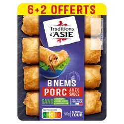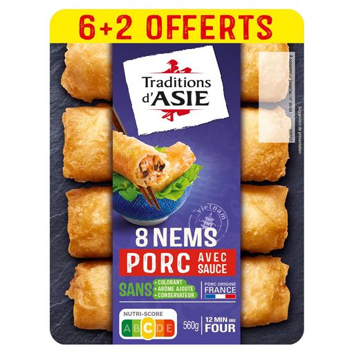 Ingrédients: Nems au porc 8 x 60 g : galette de riz 37,5% (eau, farine de riz, sel), viande de porc 11,2% et gras de porc (origine France), carottes, oignons, vermicelles réhydratés (eau, amidon de pois), huile de tournesol, champignons noirs réhydratés, farine de soja texturée, eau, protéines de soja, sauce POISSON (POISSON, sel, eau), sel, menthe douce. (pourcentages exprimés sur les nems) Sauce nuoc-mâm 2 x 40 g : eau, sucre, vinaigre d'alcool, sel, nuoc-mâm 1,6% (POISSON, sel, eau), sauce SOJA (eau, graines de SOJA, sel, farine de BLE). (pourcentage exprimé sur la sauce) Galette : cuisinée en France. Viande de porc : origine France. Traces possibles de : mollusques, lait, oeuf, céleri, moutarde, sésame