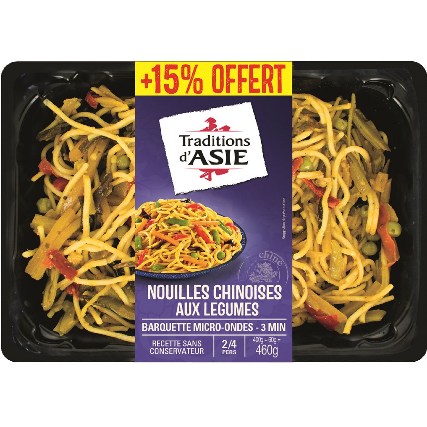 Ces nouilles chinoises aux légumes apporteront l'Asie à votre table. Cette recette à base de nouilles et de légumes est délicatement parfumée à la citronnelle et au basilic thaï, un plat gourmand qui ravira toute la famille ! Les nouilles chinoises sont présentées dans une barquette micro-ondable pour un réchauffage rapide et pratique.