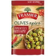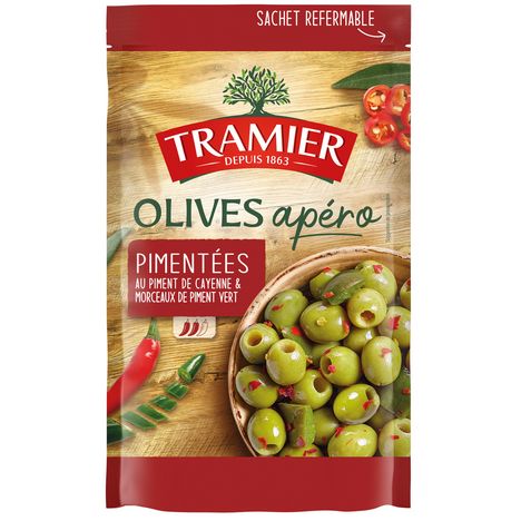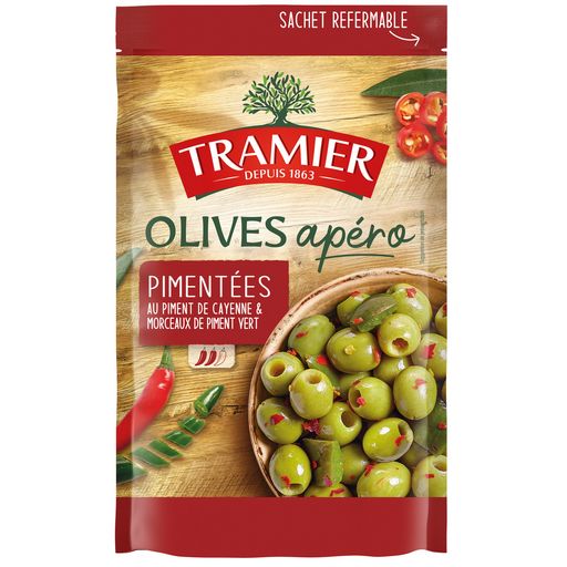 Des olives vertes dénoyautées de variété Manzanilla, récoltées en Espagne, avec des morceaux de piment vert et des éclats de piment de Cayenne : un goût subtilement relevé.