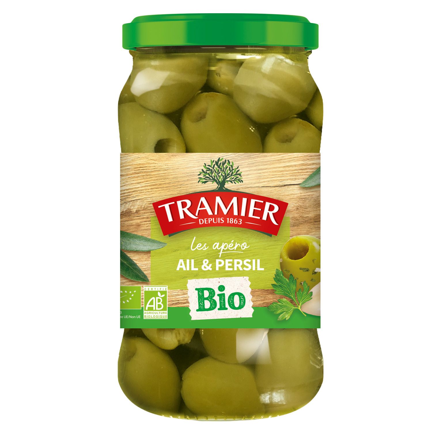 Ces olives vertes dénoyautées Ail et Persil Bio seront idéales pour vos apéritifs et recettes.