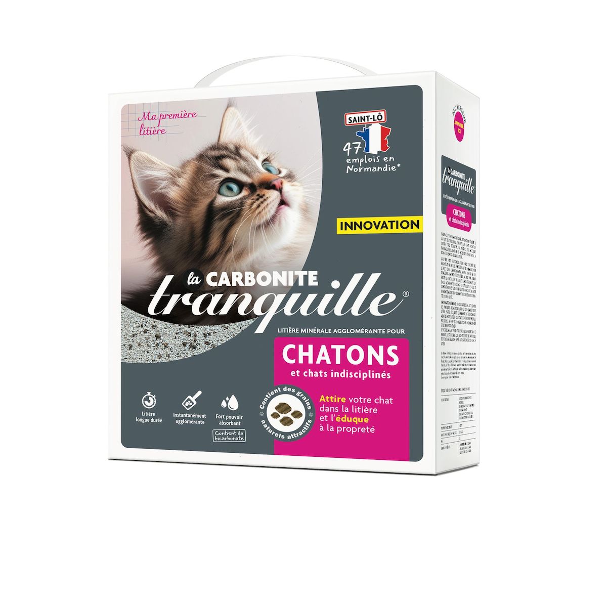 litière minérale longue durée agglomérante, avec des grains attractifs naturels pour éduquer le jeune chat à sa litière.
