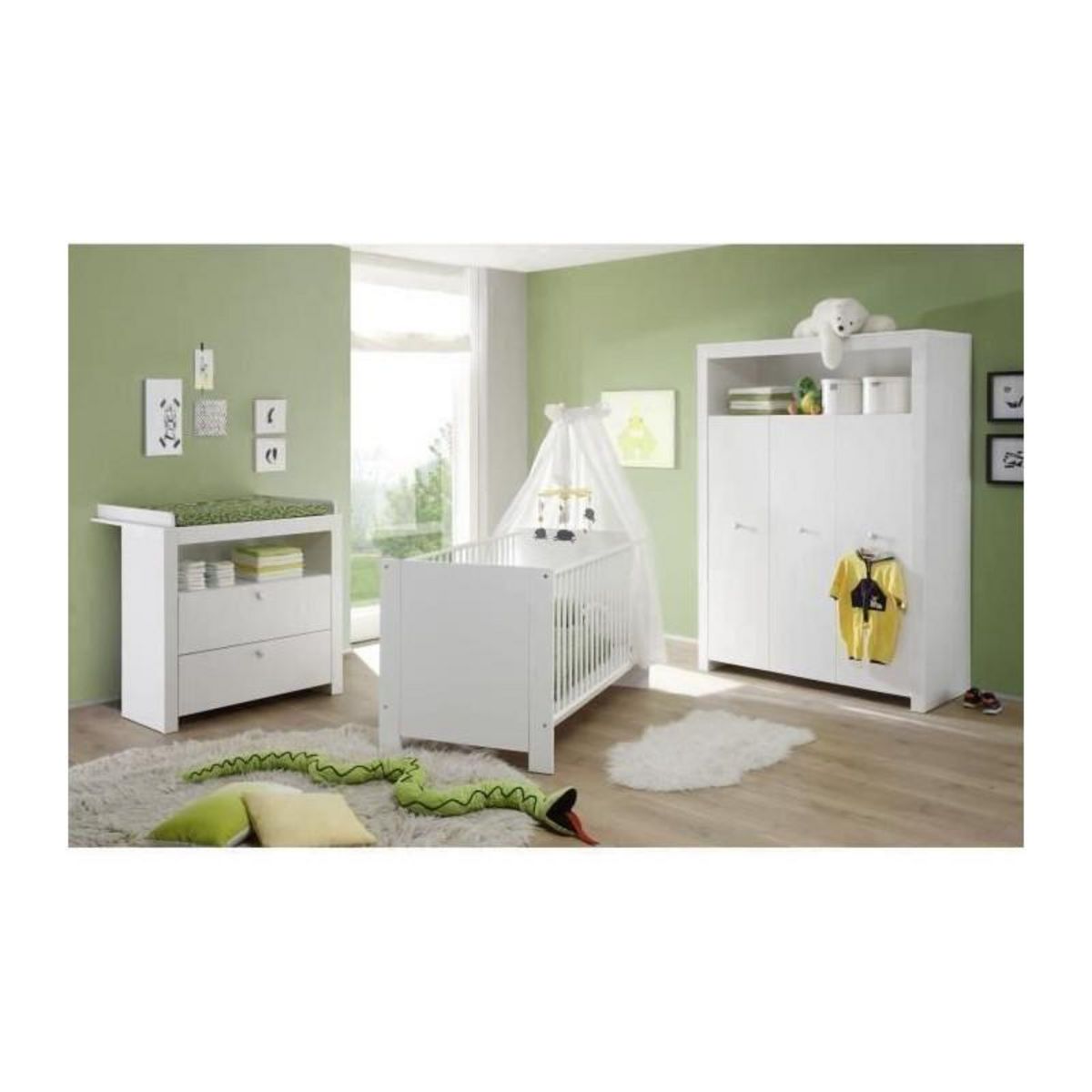 - **Conception complète** : Lit, armoire et commode pour une chambre de bébé entièrement équipée.