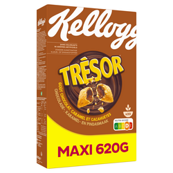 Trésor goût Chocolat, Caramel et Cacahouètes, c’est le nouveau parfum de Trésor. Tout le plaisir d’un cœur fondant et gourmand au délicieux goût de chocolat et caramel avec une pointe de cacahouètes dans une coque de céréales croustillante : cette sensation croquante-fondante de Trésor qui rend accro tous les chocovores ! Céréales fourrées au goût chocolat au lait, caramel et cacahuètes, enrichies en vitamines et en fer.