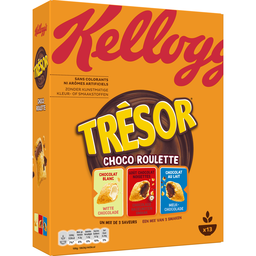 Trésor Choco Roulette, c'est un mix de 3 saveurs de céréales croustillantes au cœur fondant goûts chocolat au lait, chocolat blanc, et chocolat noisettes. Trésor Choco Roulette, une surprise à chaque cuillère ! Assortiment de 3 céréales fourrées (saveurs chocolat au lait, chocolat blanc et chocolat noisette), enrichies en vitamines et en fer.