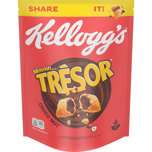 Les délicieuses céréales Trésor dans un nouveau format pratique à emporter partout ! Parfait pour accompagner vos pauses gourmandes au cours de la journée, en solo ou entre amis ! Céréales fourrées au goût chocolat noisettes, enrichies en vitamines et en fer.