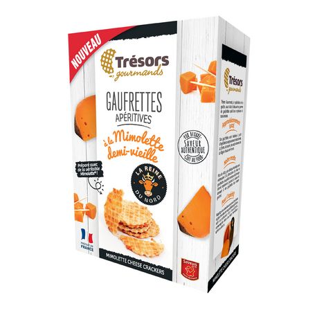 Plus de 300g de Mimolette demi-vielle par kilo donnent à ces gaufrettes leur jolie couleur orangée et leur saveur inimitable.