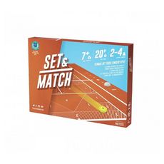 Set et Match est le jeu de tennis qui recrée le match hors du court, à coup de pichenettes. Motricité fine, Perception visuelle. Taille : 36 x 26 x 3 cm. Poids : 0,81 kg. 1 plateau (terrain de tennis), 2 balles (disques avec feutrine), 1 pion marqueur de score, 6 pions marqueurs de jeu et 1 livret de règles.
