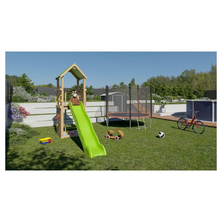 Apportez à vos un enfants un moment de détente et d'amusement bien mérité avec cette aire de jeux SUNNY XPERIENCE. L'aire de jeux est prévu pour accueillir un ensemble de 5 enfants simultanément, elle est composée d'un mur de grimpe, d'un bac à sable, ainsi que d'une plateforme avec toboggan. L'aire d jeux est composée de matériaux respectueux de l'environnement. Un moment de plaisir pour vos enfants lors des belles journées ensoleillées dans votre jardin.