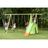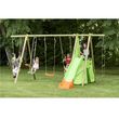 Balançoires soufflées, réglables par tendeur, coloris orange. Sièges face à face soufflés coloris orange, repose pieds verts et montants coloris sable. Siège bébé barre de protection à l'avent, plastique traité anti-UV, 9 à 36 mois. Ecgelle de corde, anneaux de suspension métal, corde polypropylène couleur chanvre et traitée anti-UV. Barreaux bois, longueur de 30 cm, diamètre 2 cm. Trapèze anneaux, plastique coloris vert, anneux diamètre 13cm, huit de réglage métal, cordes polypropylène réglables couleur chanvre et traitées anti-UV. Toboggan 2,63m de glissière coloris vert et sabot orange en plastique. Arrivée en pente douce.