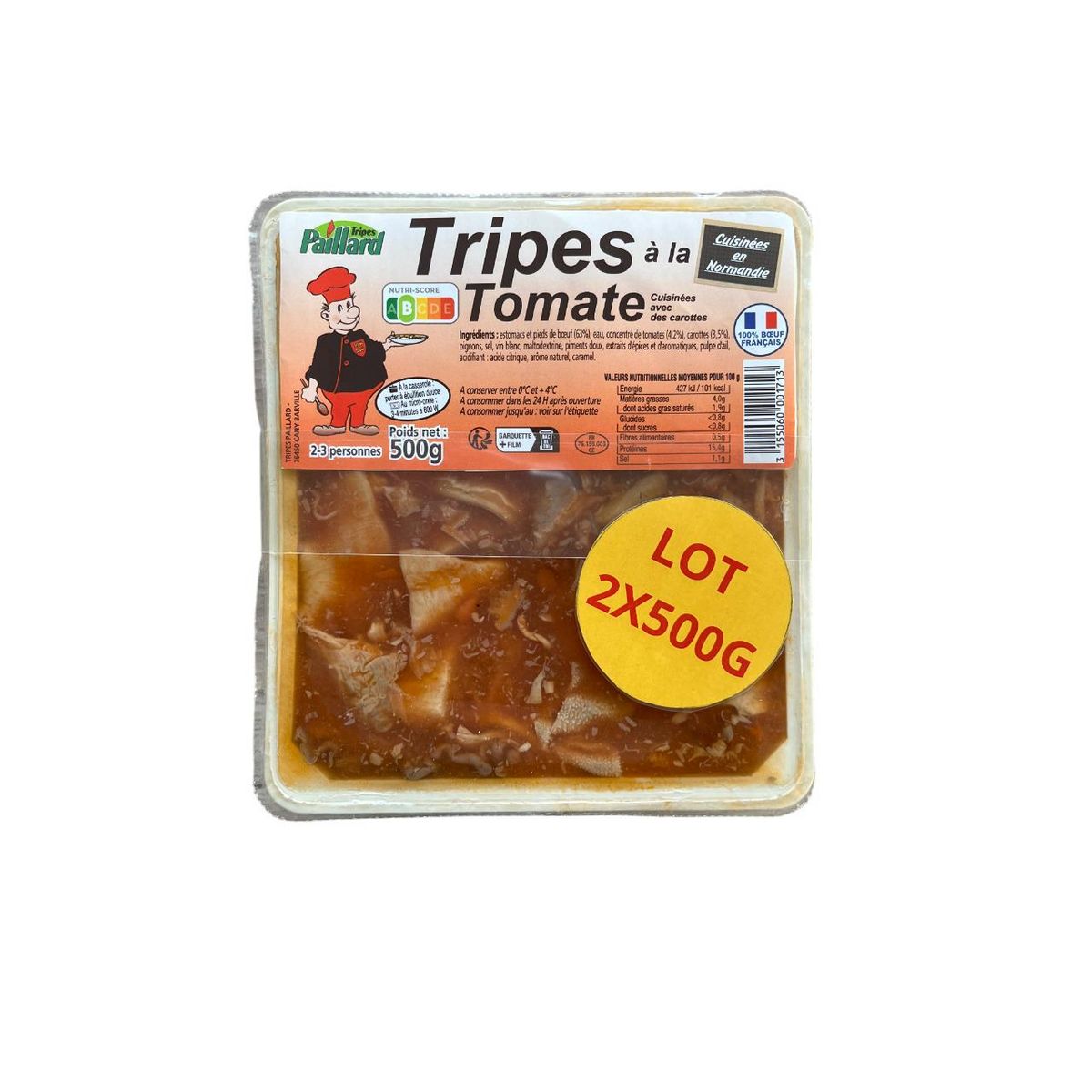 Ingrédients : Estomacs et pieds de bœuf (63%) (ORIGINE France), eau, concentré de tomate (4.2%), carottes (3.5%), oignons, sel, vin blanc, maltodextrine, piments doux, extraits d’épices et de plantes aromatiques, pulpe d’ail, acidifiant : acide citrique.