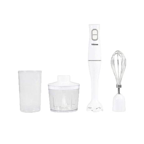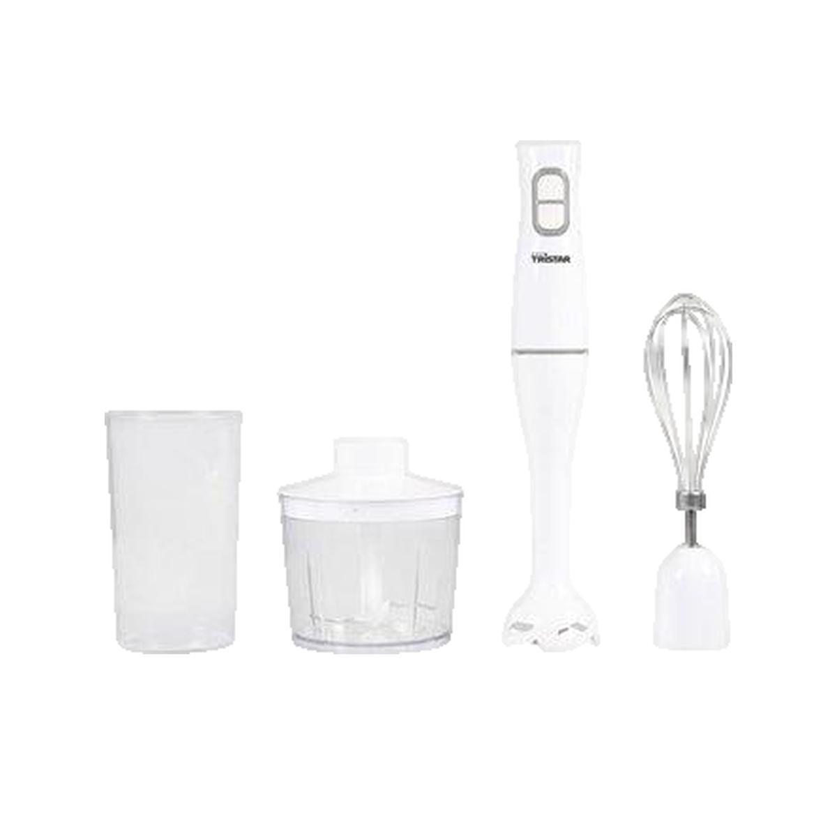 Le mixeur plongeant Tristar MX-4851 est un appareil polyvalent conçu pour la cuisine. Il dispose d'une puissance de 350 W, d'une fonction turbo, de deux niveaux de vitesse ainsi que d'une fonction pulse. Son corps en plastique durable est équipé de lames en acier inoxydable, adaptées pour mélanger, hacher et fouetter. Il est facile à nettoyer grâce à ses pièces détachables. Ce mixeur est livré avec un hachoir, un fouet et un verre doseur, offrant une commodité optimale pour un usage quotidien.