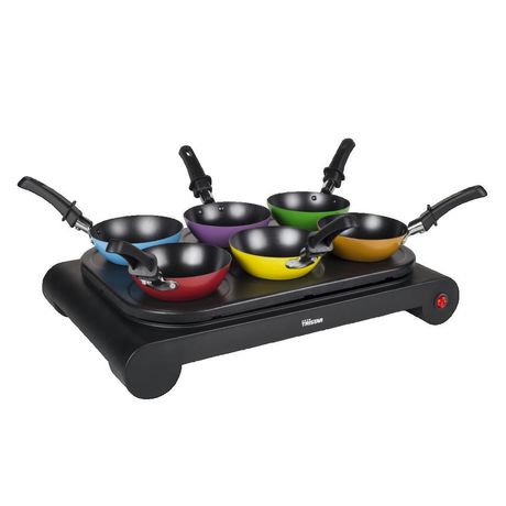 Le wok électrique Tristar BP-2827 est un appareil de cuisson festive idéal pour cuisiner en famille ou entre amis. Il comprend 6 poêles à wok individuelles avec une plaque chauffante intégrée de 40 x 27.5 cm, permettant à chaque convive de préparer son propre plat. Avec une puissance de 1000 W, il c