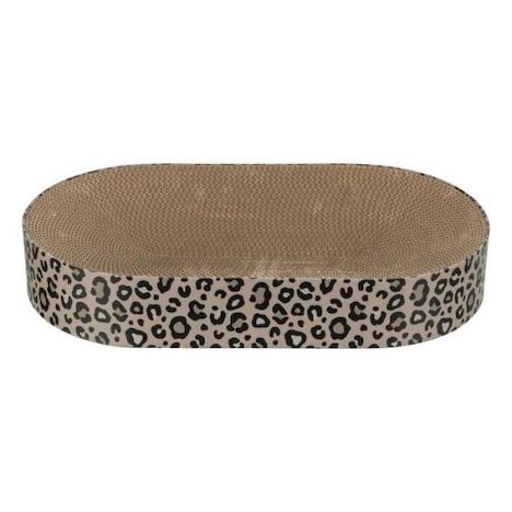 Lit griffoir TRIXIE LEO brun imprimé léopard : un espace cosy pour se reposer et griffer. En carton avec herbe a chat pour stimuler votre chat. Dimensions : 63 x 10 x 35 cm.