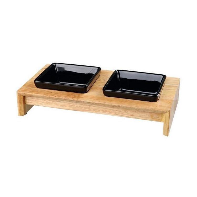 Le TRIXIE Set écuelles 28x5x15cm - 2x0,2l - Noir se distingue par son design élégant et moderne, parfait pour s'intégrer dans n'importe quel décor intérieur. Le noir mat du support et des écuelles apporte une touche de sophistication, tandis que le bois massif verni ajoute une note de chaleur et de rusticité, créant ainsi un ensemble visuellement attrayant.