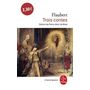 Je me souviens d'avoir eu des battements de coeur, d'avoir ressenti un plaisir violent en contemplant un mur de l'Acropole, un mur tout nu (celui qui est à gauche quand on monte aux Propylées). Eh bien ! je me demande si un livre, indépendamment de ce qu'il dit, ne peut pas produire le même effet. Dans la précision des assemblages, la rareté des éléments, le poli de la surface, l'harmonie de l'ensemble, n'y a-t-il pas une vertu intrinsèque, une éspèce de force divine, quelque chose d'éternel comme un principe ? Ce principe évoqué par Flaubert à l'adresse de son amie George Sand, c'est celui des Trois Contes qu'il publie en 1877, trois ans avant sa mort, et qui sont comme le testament littéraire où s'affirme son ultime conception de l'écriture. Récits éblouissants, limpides et cependant énigmatiques, Un coeur simple, La Légende de saint Julien l'Hospitalier et Hérodias nous conduisent de l'Occident moderne à l'Orient des débuts de notre ère : entre mots et images, ils nous parlent de l'amour et de la folie, du quotidien et du sacré, et de notre inexorable besoin d'eternité.