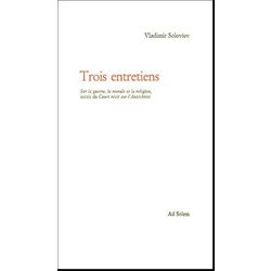 Ces Trois entretiens sur la guerre, la morale et la religion constituent le dernier livre de Vladimir Soloviev (publié peu de temps après sa mort, en 1900). On peut à juste titre y voir le testament philosophique, politique et religieux de celui qui a sans doute été le plus grand penseur russe du XIXe siècle. Trois protagonistes : un Général, un Homme politique et Monsieur Z (alias Vladimir Soloviev), personnifications des vérités du passé, du présent et de l'avenir, s'opposent dans un dialogue très vif au représentant de l'erreur sous toutes ses formes qu'est le Prince (disciple de Tolstoï et à ce titre agent d'une confusion mentale et spirituelle qui en fait un précurseur de l'Antéchrist). A travers ces trois entretiens , Vladimir Soloviev montre le caractère indispensable de l'Etat, de la culture, de l'Eglise - du progrès et des institutions humaines en général - au moment où une lumière crépusculaire commence à descendre sur les valeurs qui formaient la civilisation occidentale. Au fil d'un dialogue où s'entremêlent admirablement gravité et humour, la courtoisie des échanges se voit perturbée par le sentiment d'une menace diffuse, qui altère la limpidité de l'atmosphère. Un temps s'achève. Un autre commence, prélude à ce temps de la fin des temps (le nôtre ?) que décrit en conclusion le Court récit sur l'Antéchrist, où face à la persécution que l'Antéchrist a déclenchée contre les chrétiens du monde entier, les représentants de l'Orthodoxie (le moine Jean) et du Protestantisme (le pasteur Paulus) prennent refuge auprès du pape Pierre II, qui scelle dans le martyre le retour à l'Unité des communautés chrétiennes divisées.