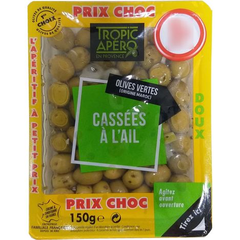 Olives d'import 79%, huile de tournesol, sel, ail, oignon, piment, persil, acidifiants (E330, vinaigre)