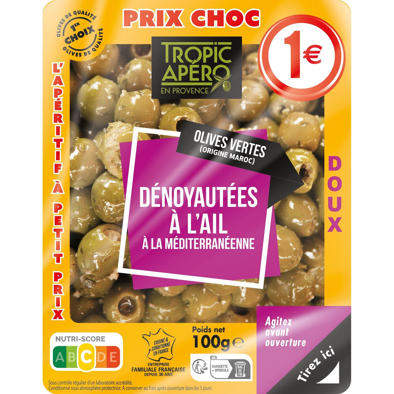 olives bien préparées, mais il y en a peu dans la barquette vu que des gousses d'ail ajoute du poids