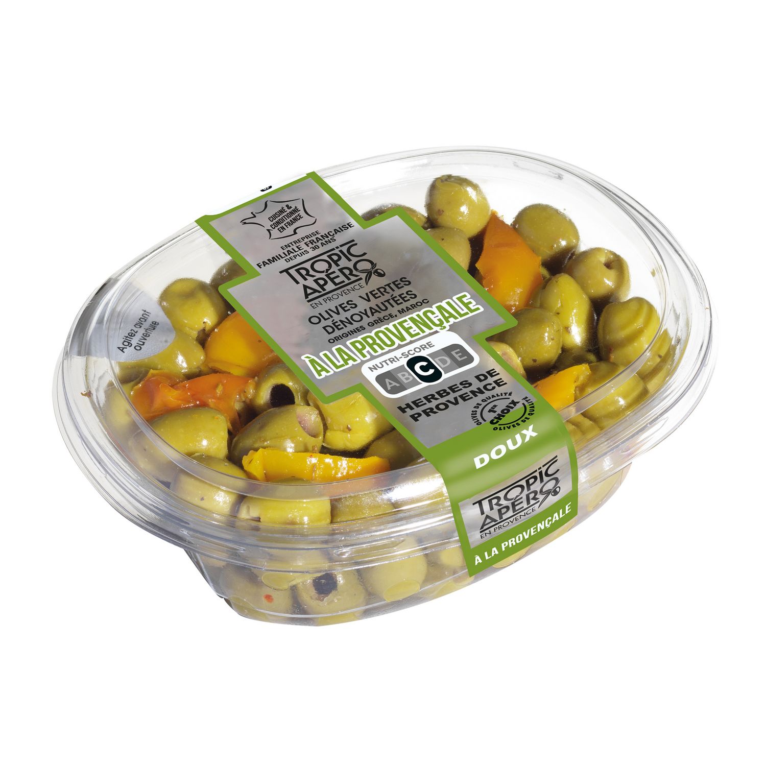 Ingrédients : Olive verte dénoyautée 82% origine UE (Grèce)/non UE (Maroc) selon approvisionnements, huile de colza, Poivron confit, sel, herbes de Provence 0,1%, laurier, acidifiants : vinaigre et E330