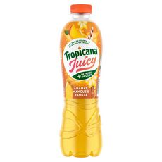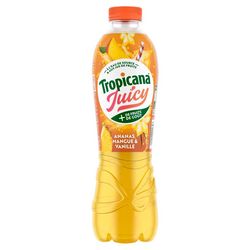Se faire plaisir, c'est mieux avec du goût ! Tropicana Juicy, c'est +30%* de fruits pour un moment rafraîchissant ananas, mangue & vanille. *Comparé à la moyenne des boissons aux fruits plates. Sans arôme artificiel Sans conservateur Sans édulcorant