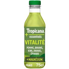 Vitalité Envie de bien-être? Retrouvez vos fruits préférés & une touche de légume dans Tropicana Essentiels Vitalité, enrichi des bienfaits du magnésium et de la vitamine C. Une délicieuse recette pour revigorer votre journée ! A déguster dans le cadre d'une alimentation équilibrée et d'un mode de vie sain. Mélange à base de 4 fruits, épinard et eau de pomme, enrichi en magnésium et en vitamine C, avec arôme naturel.