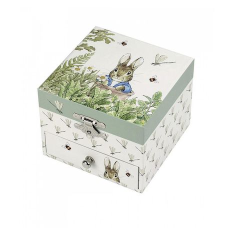 UNE BOÎTE MUSICALE POUR RANGER SES TRÉSORS :cette boîte à musique en forme de cube et disposant d'un tiroir émerveillera l'enfant qui y rangera ses trésors. Actionnez la manivelle et la figurine de Pierre Lapin s'anime comme par magie au son de la musique ! Pierre Lapin (The Tale of Peter Rabbit) es