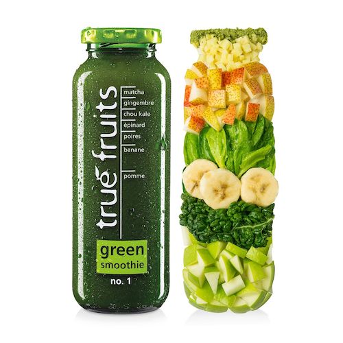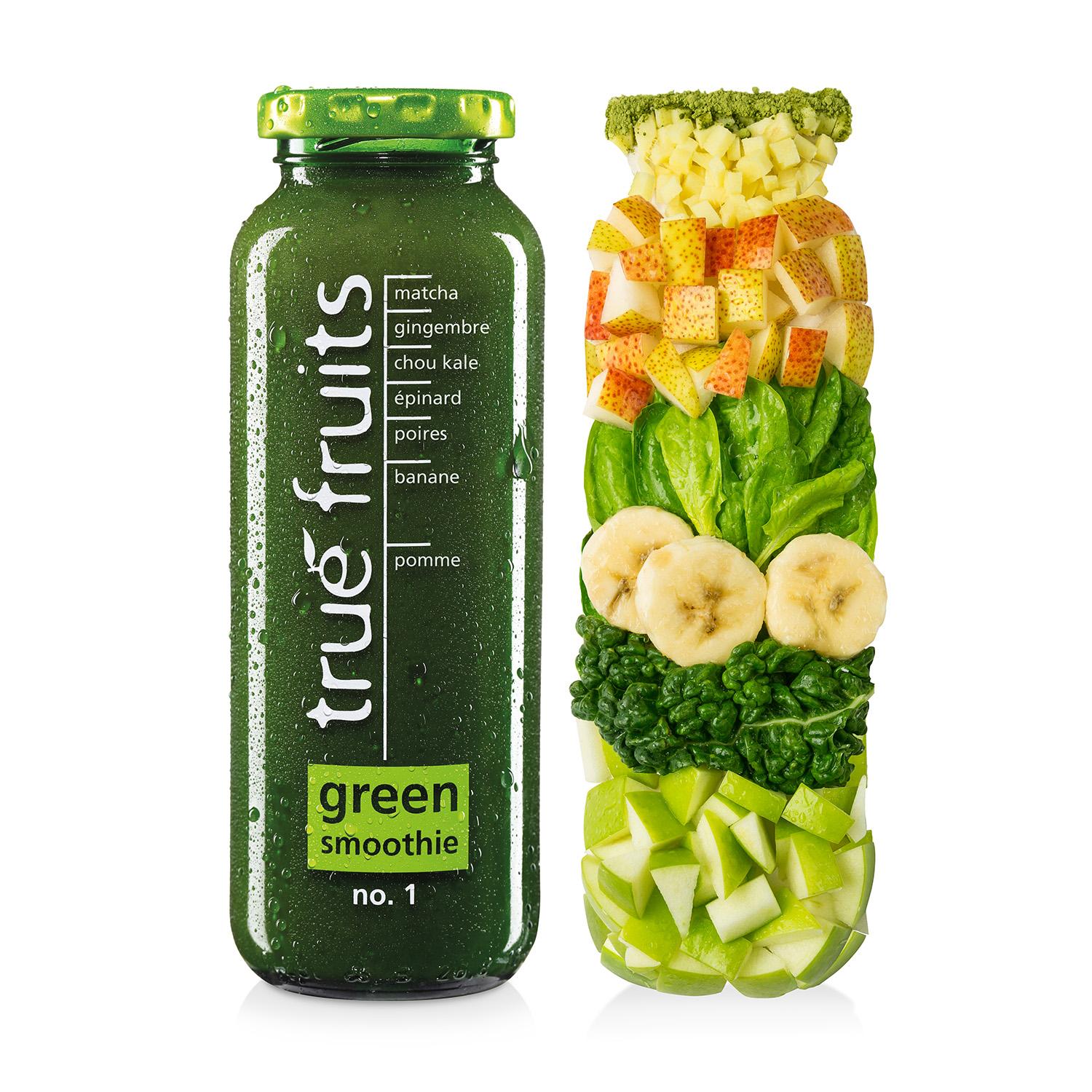 54,9 % de jus de pomme, 21 % de purée de banane, 11 % de purée d‘épinard, 8 % de purée de poire, 4 % de purée de chou kale, 1 % de purée de gingembre, 0,1 % de matcha.