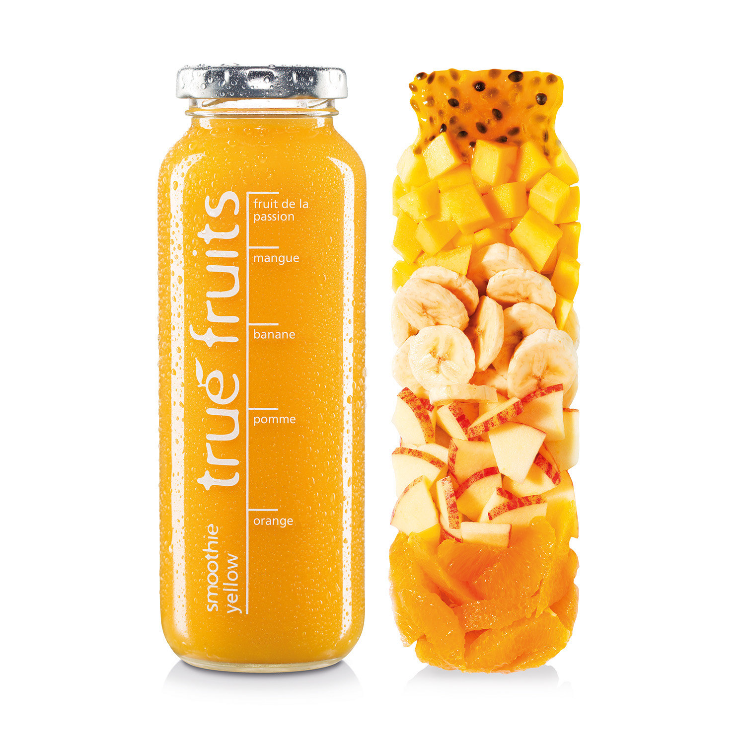 25 % de jus d‘orange, 24 % de jus de pomme, 20 % de purée de banane, 18 % de purée de mangue, 13 % de purée de fruit de la passion.