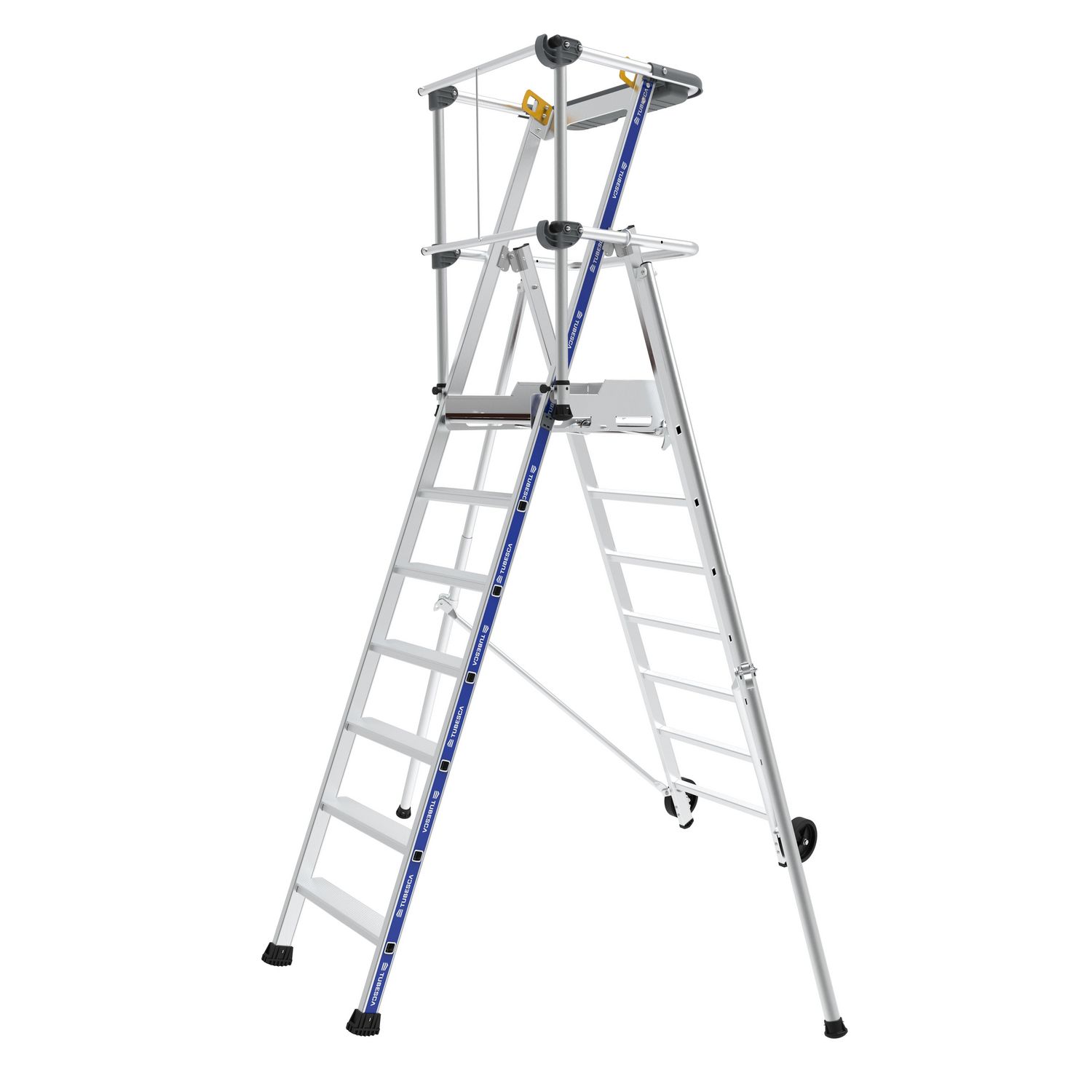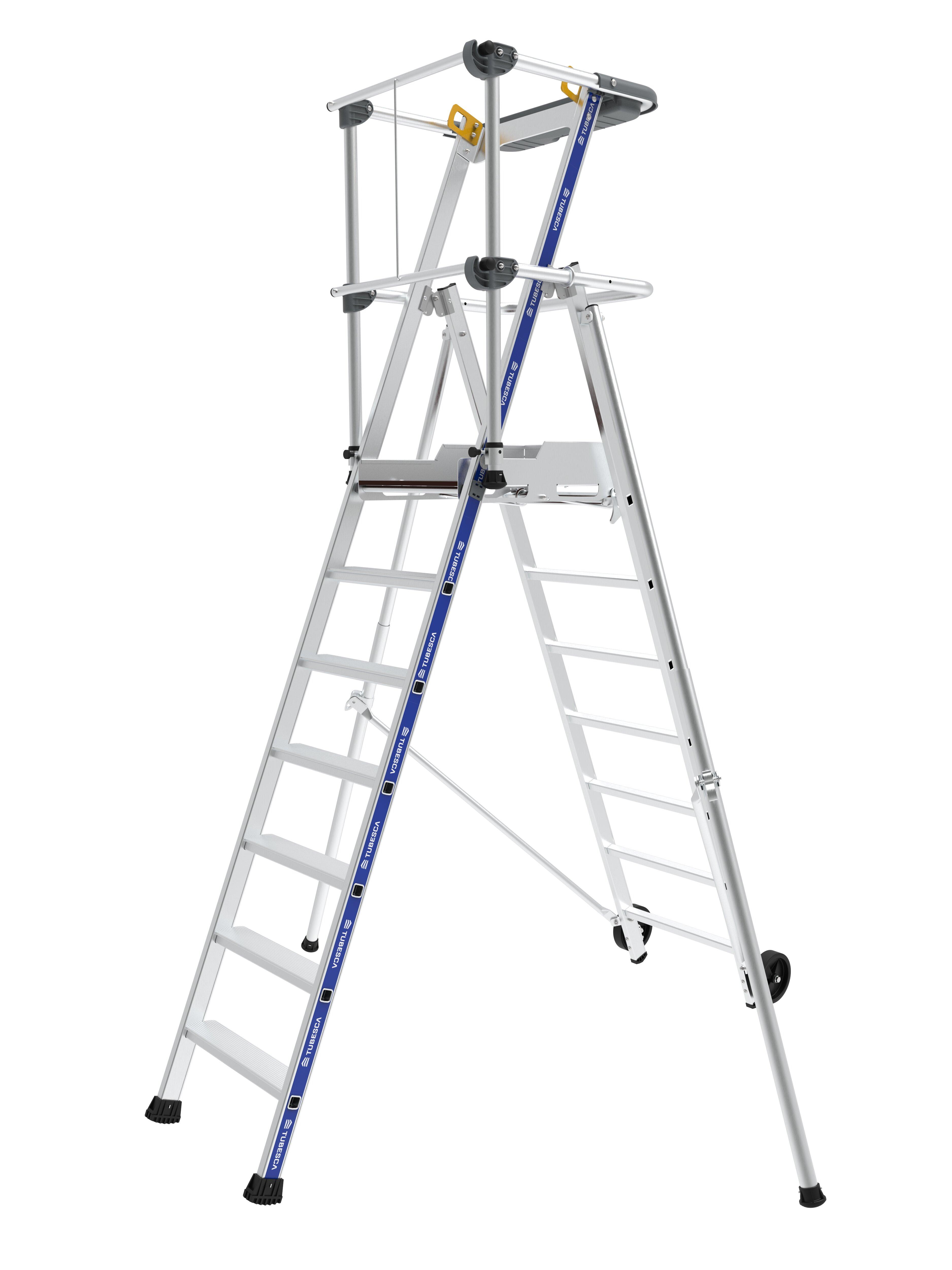 Cette PIR-PIRL en aluminium à 6 marches, s'impose comme étant la référence des plate-formes sécurisées. Ses montants renforcés, sa plate-forme large, ses stabilisateurs réglables, son garde-corps rigide semi-automatique, font du Sherpamatic un produit extrêmement robuste et stable. Il dispose d'un p