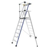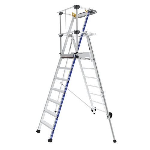 Cette PIR-PIRL en aluminium à 6 marches, s'impose comme étant la référence des plate-formes sécurisées. Ses montants renforcés, sa plate-forme large, ses stabilisateurs réglables, son garde-corps rigide semi-automatique, font du Sherpamatic un produit extrêmement robuste et stable. Il dispose d'un porte-outils, de roues de déplacement et de marches de 80 mm. Il répond aux normes PIR - PIRL et EN 131-7, au décret 2004-924 et est labellisé NF.