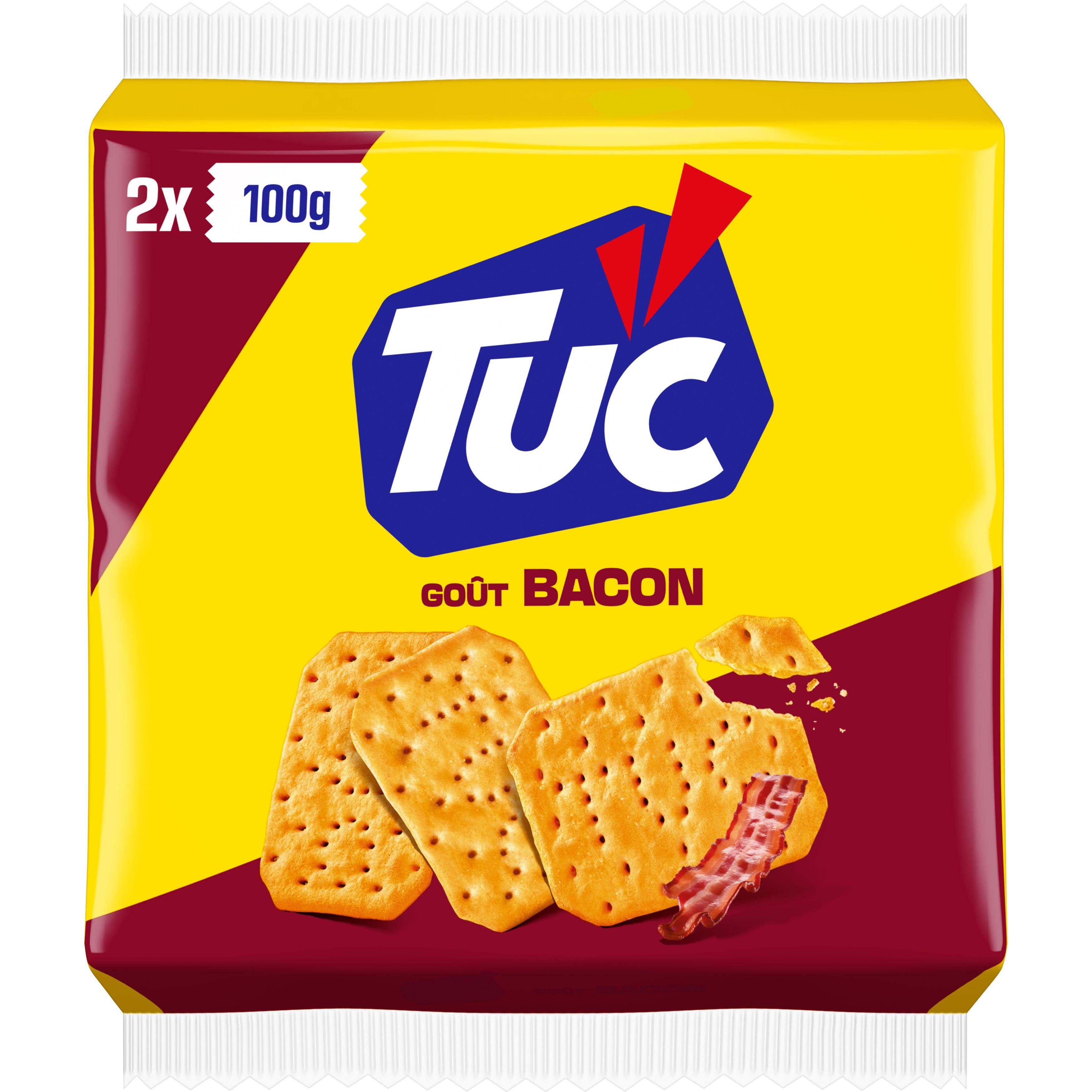 Biscuits salés apéritif TUC goût bacon dans un paquet de 200 grammes avec deux sachets de 100 grammes chacun.