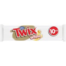 Biscuit (26%), nappage au caramel (32%) enrobé de chocolat blanc (35%) TWIX WHITE chocolat, biscuit, nappage au caramel enrobé de chocolat blanc - 10 barres 460g