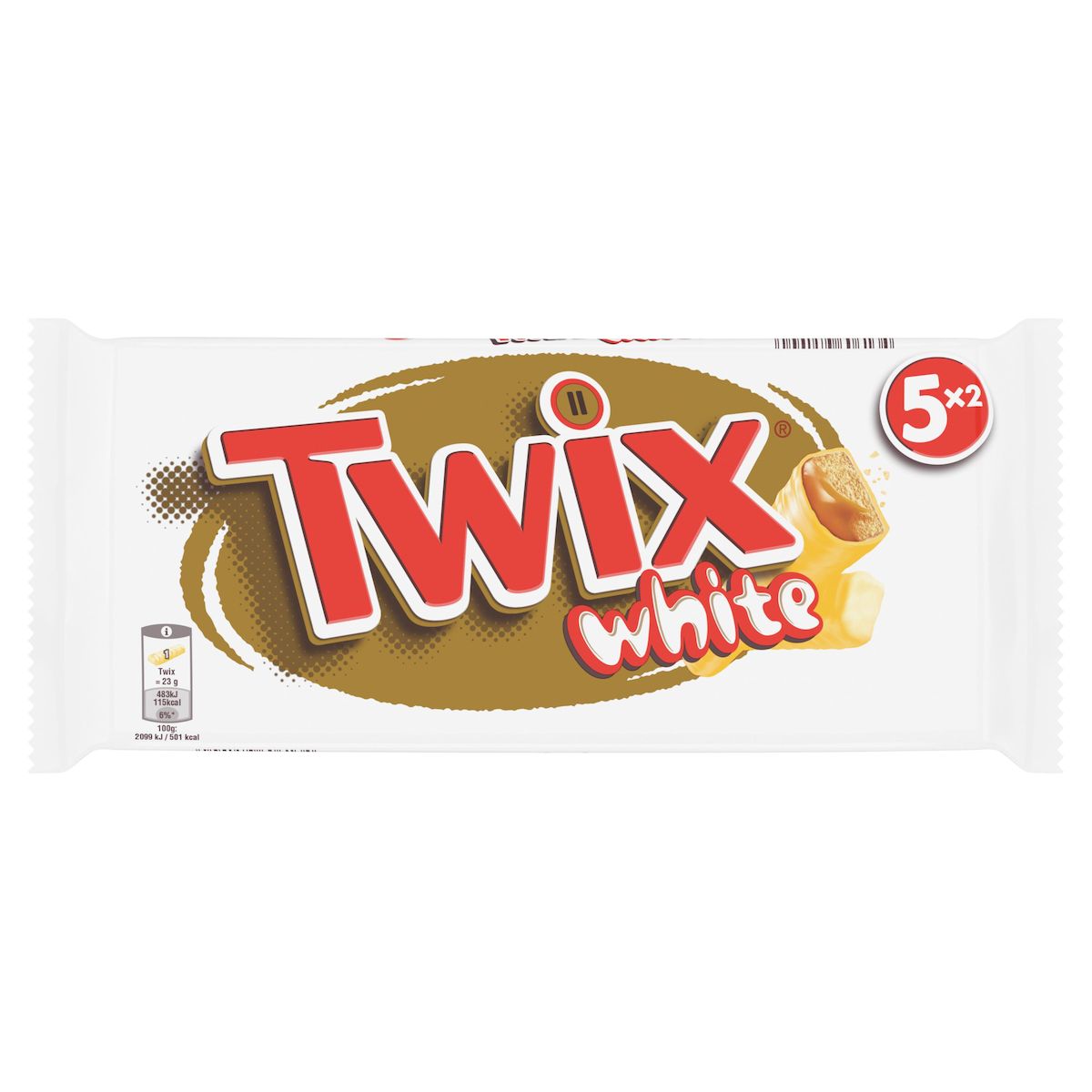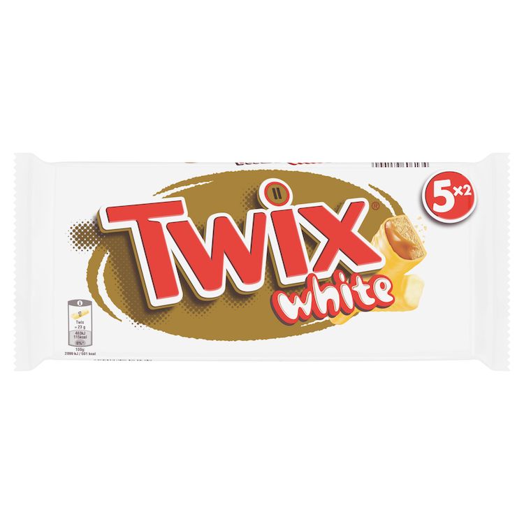 Twix : une alliance savoureuse de chocolat blanc, de caramel fondant et de biscuit croquant dans deux délicieuses barres. Aucun colorants, arômes et conservateurs artificiels utilisés. Cacao = 100% pur beurre de cacao.