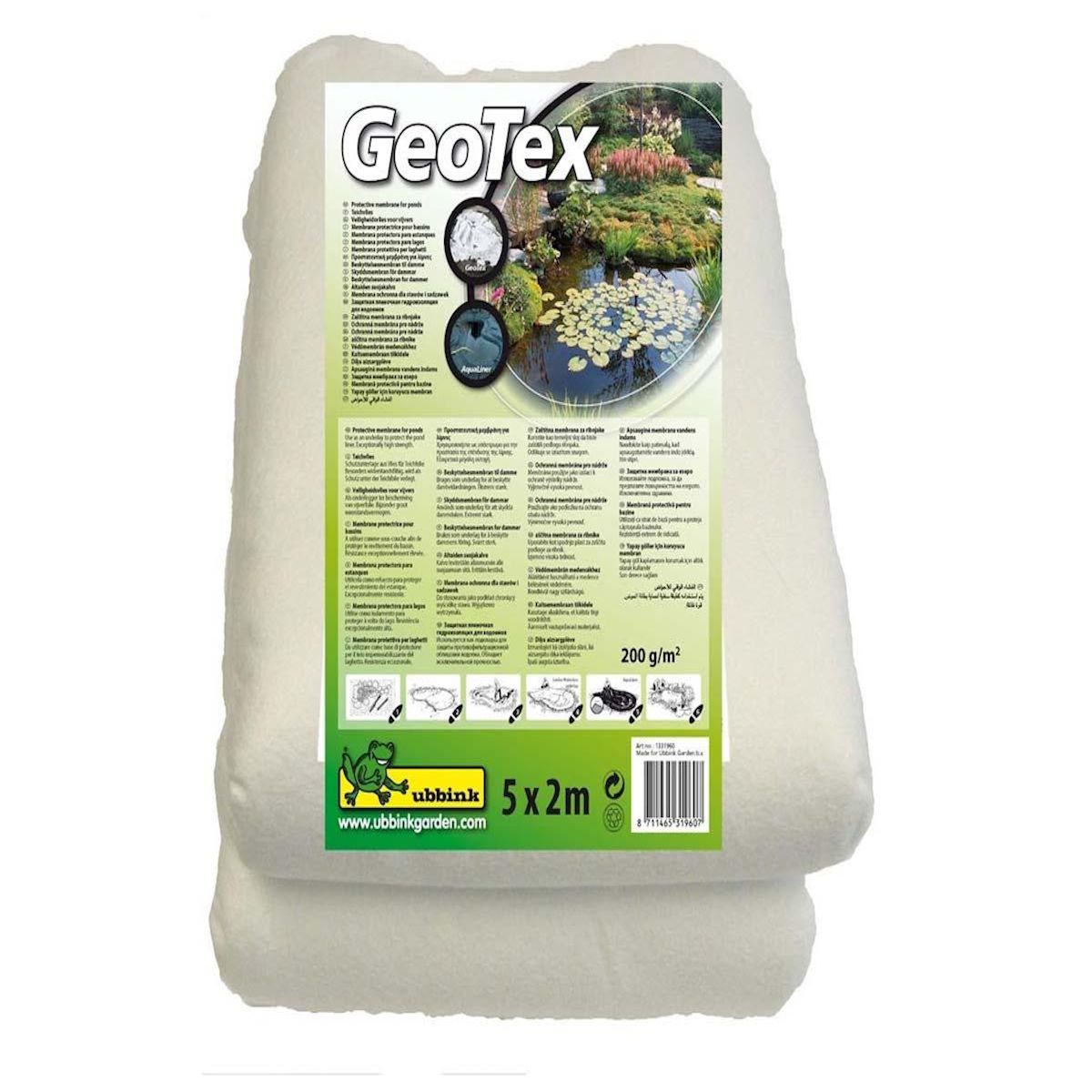 Feutre géotextile de sécurité prepacked pour bassin UBBINK,Longueur 5 m. Largeur : 2 m. Epaisseur de la bâche : 200g/m². Couleur : Blanc. Référence : 1331960.