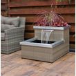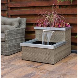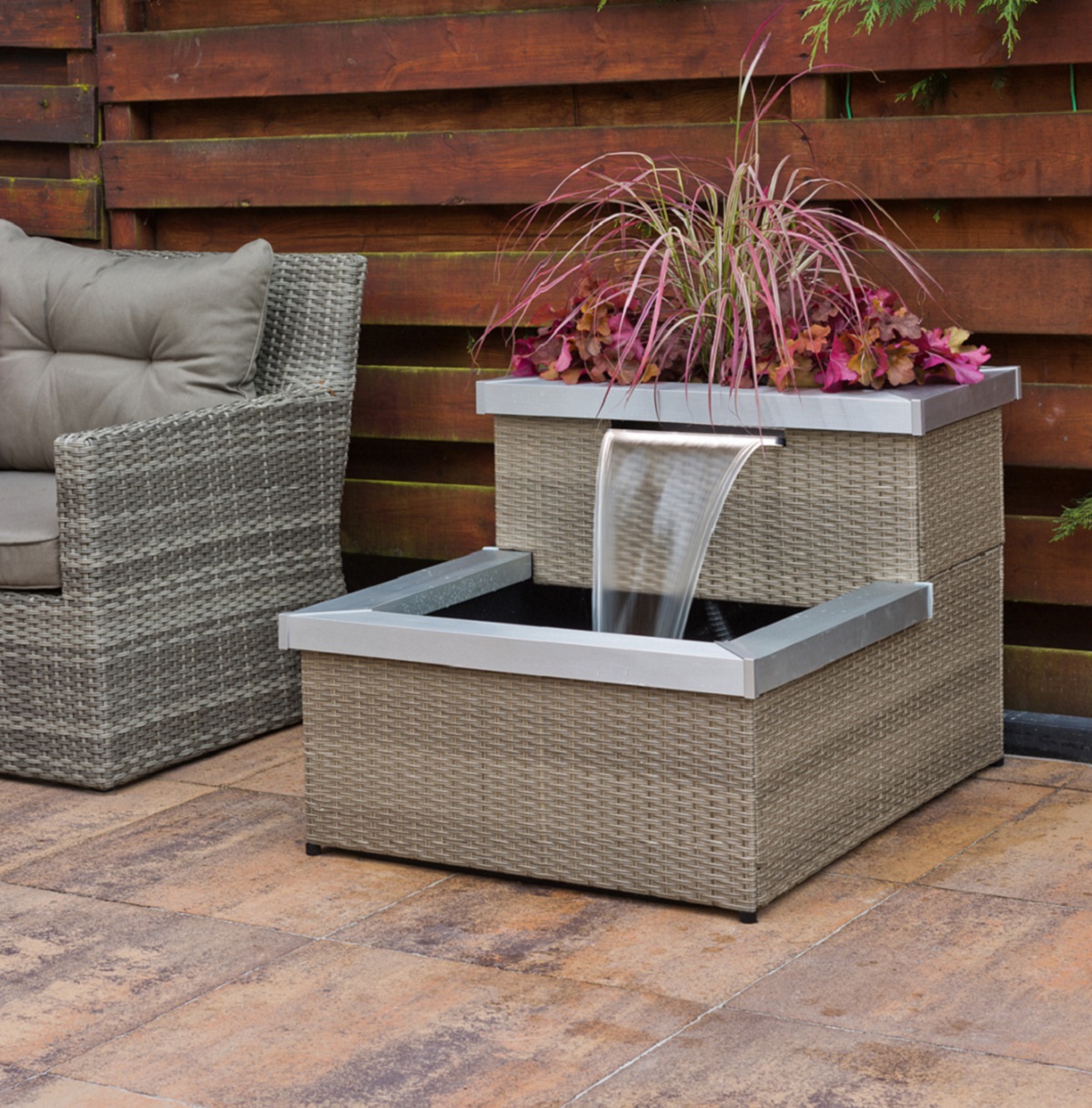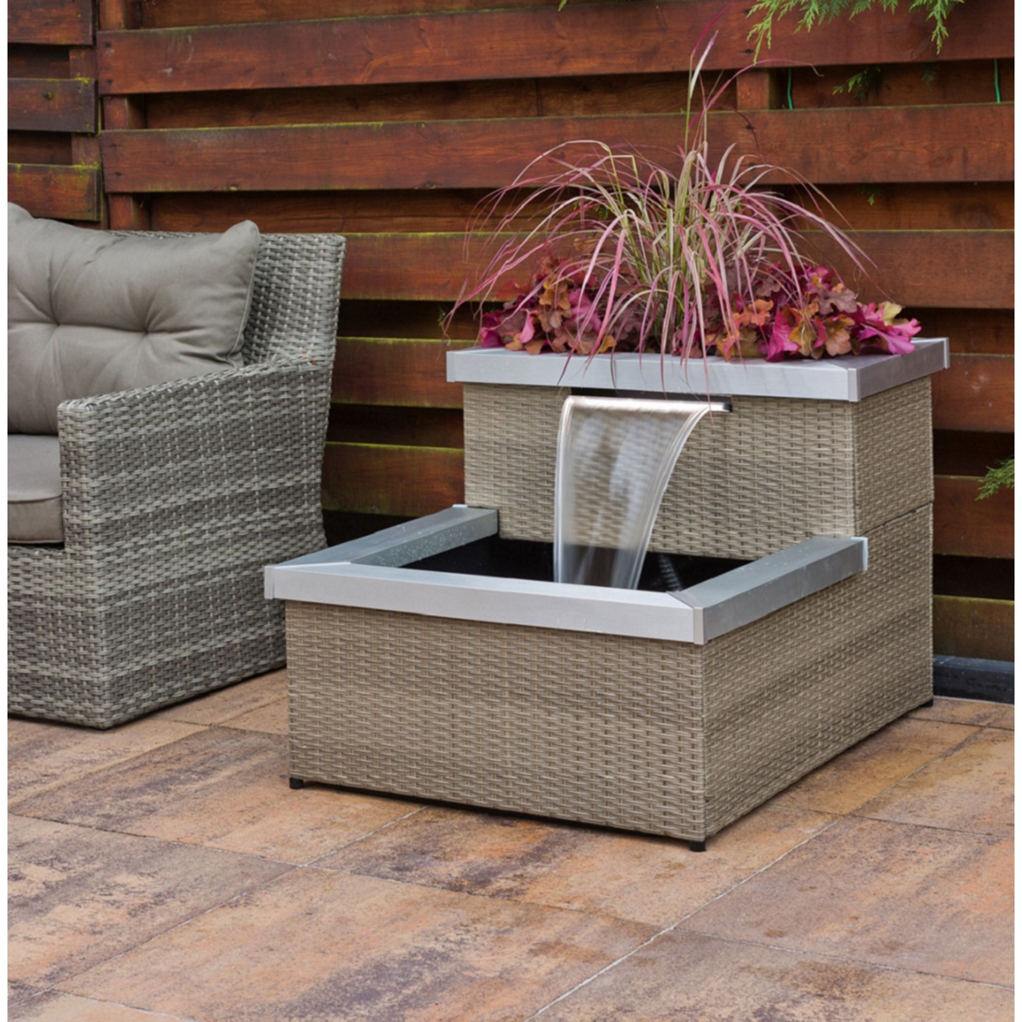 Fontaine Aveiro prête à l'emploi. Avec son socle bassin en résine tressée, cette fontaine est facile à installer. Couleur gris beige. Elle dispose d'une bâche PVC à l'intérieur assurant l'étanchéité. Rebord décoratif en aluminium - Pompe de bassin immergée 4000l/h - Lame d'eau pour chute d'eau - Espace réservé à la décoration sur la partie supérieure - Kit de tuyauterie fourni - La fontaine est garantie 1 an et la pompe 2 ans - Dimensions hors tout : L78cm x P100cm x H66cm - Poids : 22,6Kg
