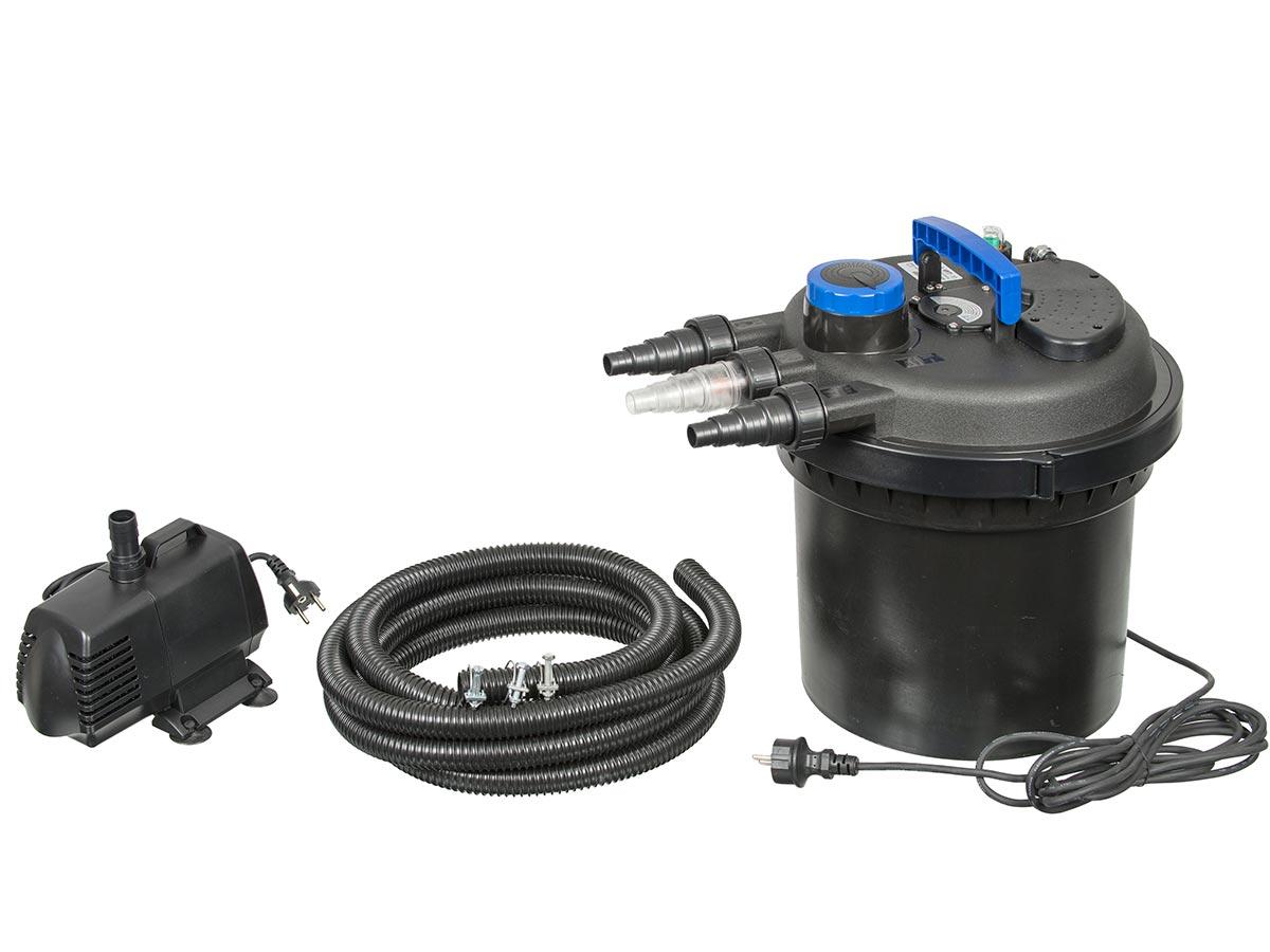 BioPressure fonctionne sous pression, ce qui signifie d'une part que l'eau peut être pompée vers un cours d'eau se trouvant plus haut et dautre part que le filtre ne peut pas déborder voire éclater, même s'il est monté à bas niveau. Le système de fittrage biomécanique et l'appareil UV-C intégré, com