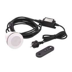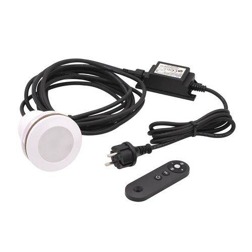 Projecteur de piscine LED Power Spot 3 RGBW UbbinkColoris blancLED rouge/vert/bleu/blancDifférent mode d'éclairage : vario, flash, dimmable(variateur) avec télecommandeAdaptable sur des parois de 10 à 55 mmCables 1,5 + 5,0 mTension nominale : 12VAC/50HZEEK A+Puissance : 10 WattIP68 Classe IIITaille