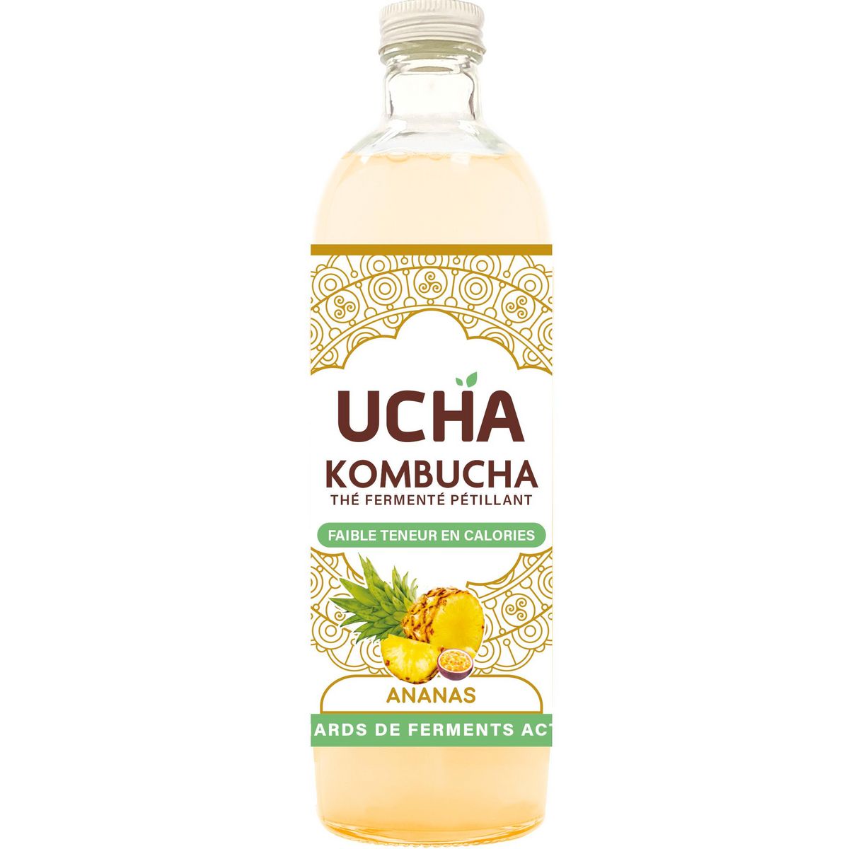 de la fermentation), thé vert*, culture de kombucha*), 5% jus d'ananas*, purée de