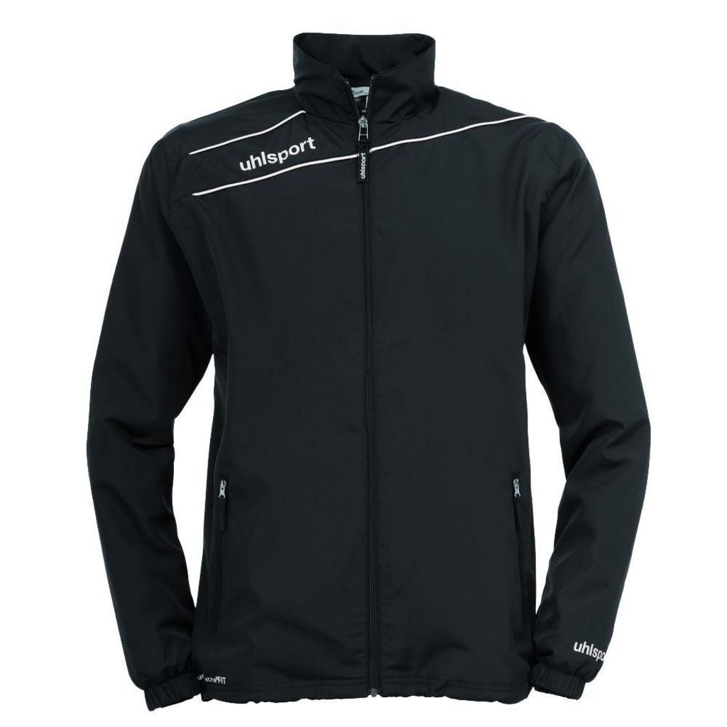 Veste de présentation pour enfant de la marque Uhlsport Coloris: Noir/Blanc Col montant Elastiques au niveau de la taille et des poignets Poches zippées Doublure en mesh 100% polyester