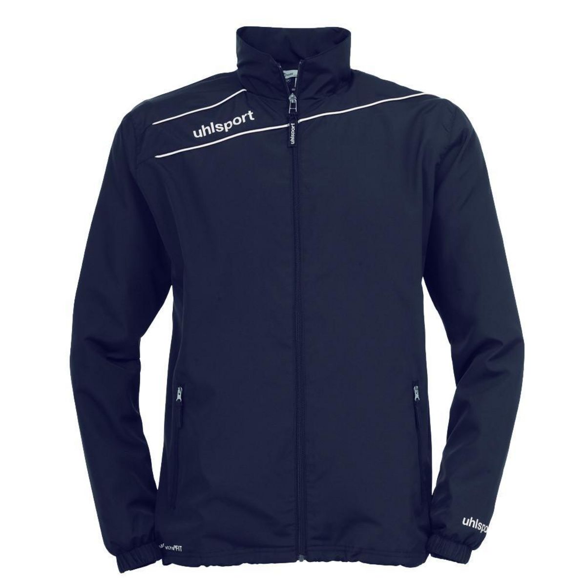 Veste de présentation pour enfant de la marque Uhlsport Coloris: Marine Col montant Elastiques au niveau de la taille et des poignets Poches zippées Doublure en mesh 100% polyester
